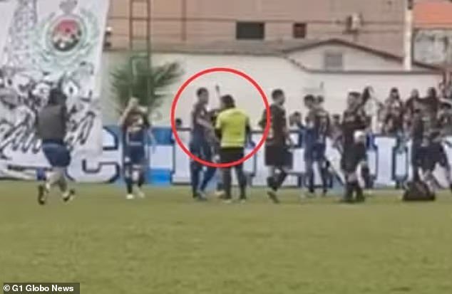 Las imágenes de video salvaje muestran que Ederson Carlos da Silva (1), quien acusó de participar en los anillos de narcotráfico durante el partido de fútbol amateur el domingo. En Guaroz.