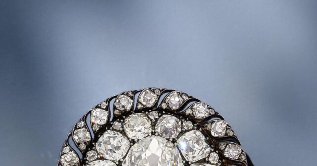 La gema redonda, fabricada a principios del siglo XIX, presenta un diamante ovalado de 13,04 quilates rodeado de diamantes más pequeños.