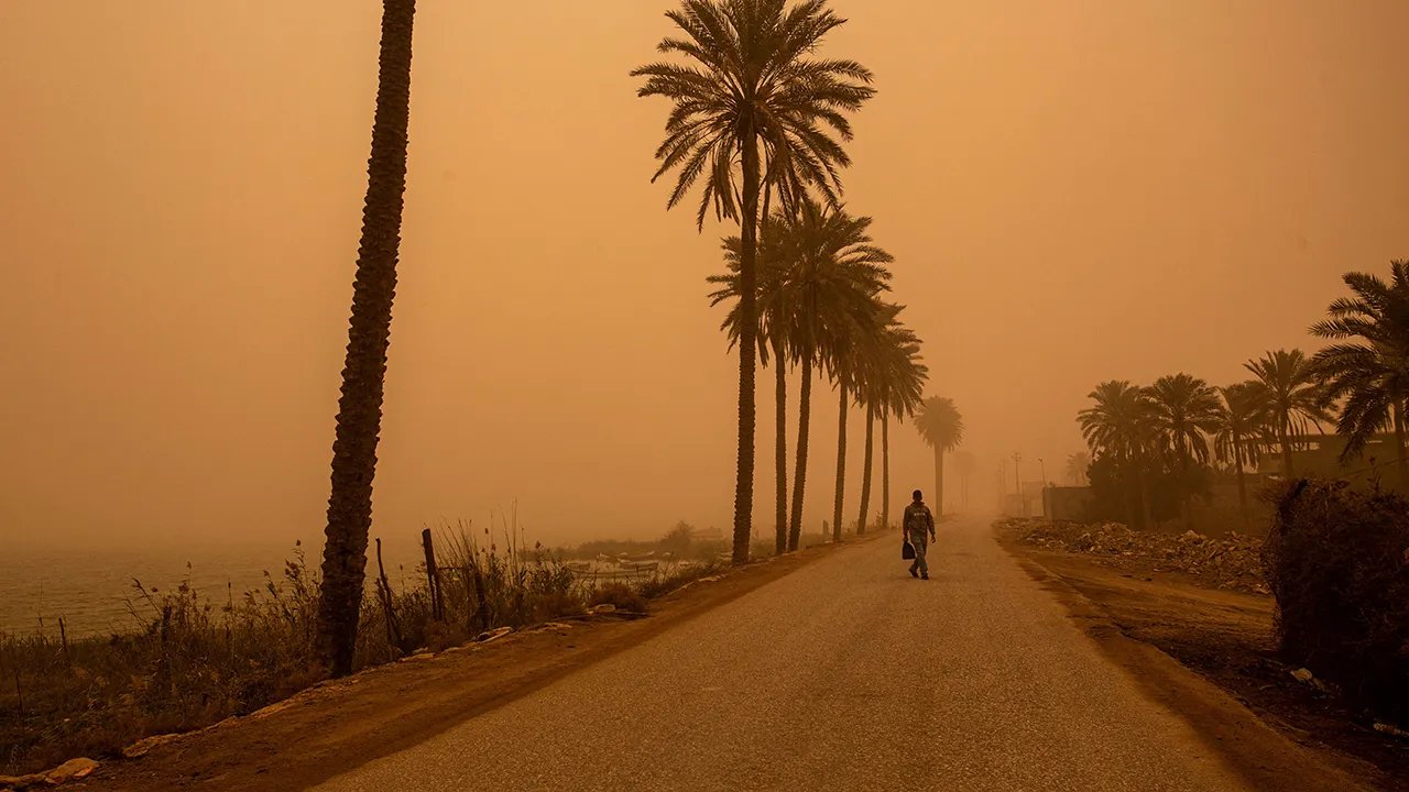 Un hombre camina por una calle durante una tormenta de arena en Basora, Irak, el 4 de marzo de 2022. (Hussein Faleh/AFP)