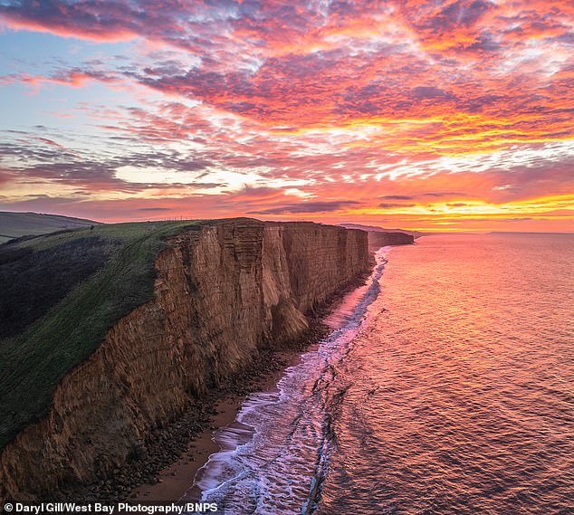 Hoy: Un ardiente amanecer rosado sobre los acantilados de West Bay en la Costa Jurásica de Dorset hoy