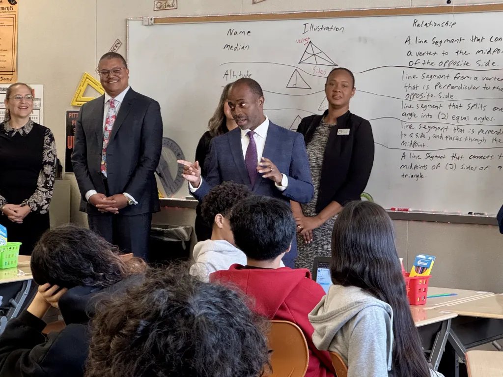 El superintendente estatal Tony Thurmond, quien visitó las escuelas secundarias de Pittsburgh el miércoles, elogió el progreso estudiantil del distrito y señaló que refleja el arduo trabajo de los educadores, los estudiantes y sus familias a pesar de los desafíos y obstáculos.