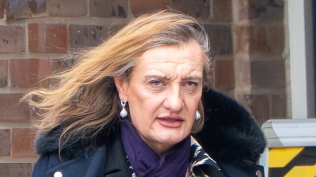 La mujer de 63 años, de pelo largo, entraba y salía de la corte vistiendo una chaqueta negra y un abrigo con adornos de piel sobre una falda negra, una blusa blanca y negra y calzas moradas con una hebilla estilo perla.