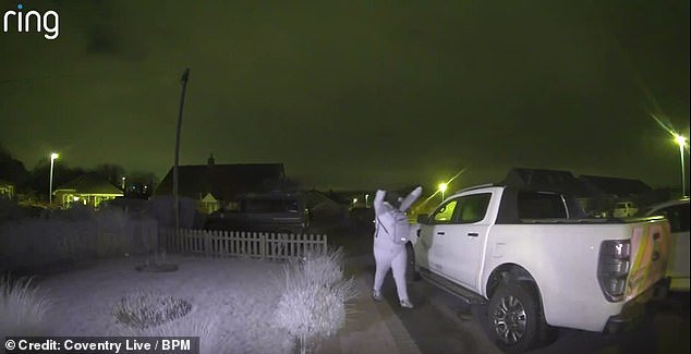 Se cree que el trío está tratando de robar una camioneta Ford Ranger estacada en el camino de entrada, cuando los ladrones fueron intentados de abrir el automóvil con la parte delantera de la casa de su compañero.