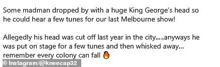 Lea una publicación en las redes sociales de la ropa de Irlanda del Norte, “Algunos locos cayeron con una enorme cabeza de rey Jorge, así que escuchó algunas melodías para nuestro último espectáculo de Melbourne”.