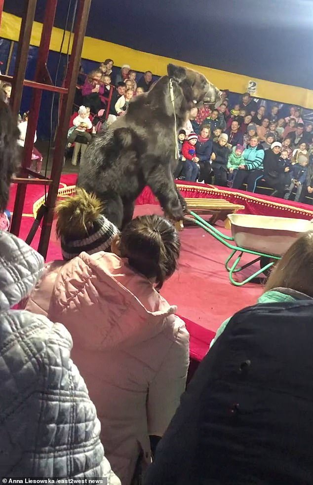 Otro trabajador de circo comenzó a patear al oso desde atrás cuando los miembros de la audiencia permitieron a la audiencia extraer la pantalla.