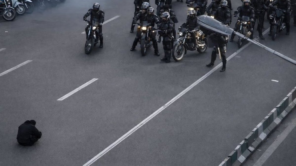 La imagen, ampliamente compartida por los medios locales, incluida la emisora Iran International, muestra a un valiente manifestante sentado en una calle de Teherán tratando de impedir que la policía armada pasee sus motocicletas por la calle.