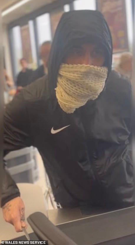 Este horrible momento fue que un ladrón enmascarado lanzó un punto de cuchillo frente a la pregunta frente a los compradores en un supermercado.