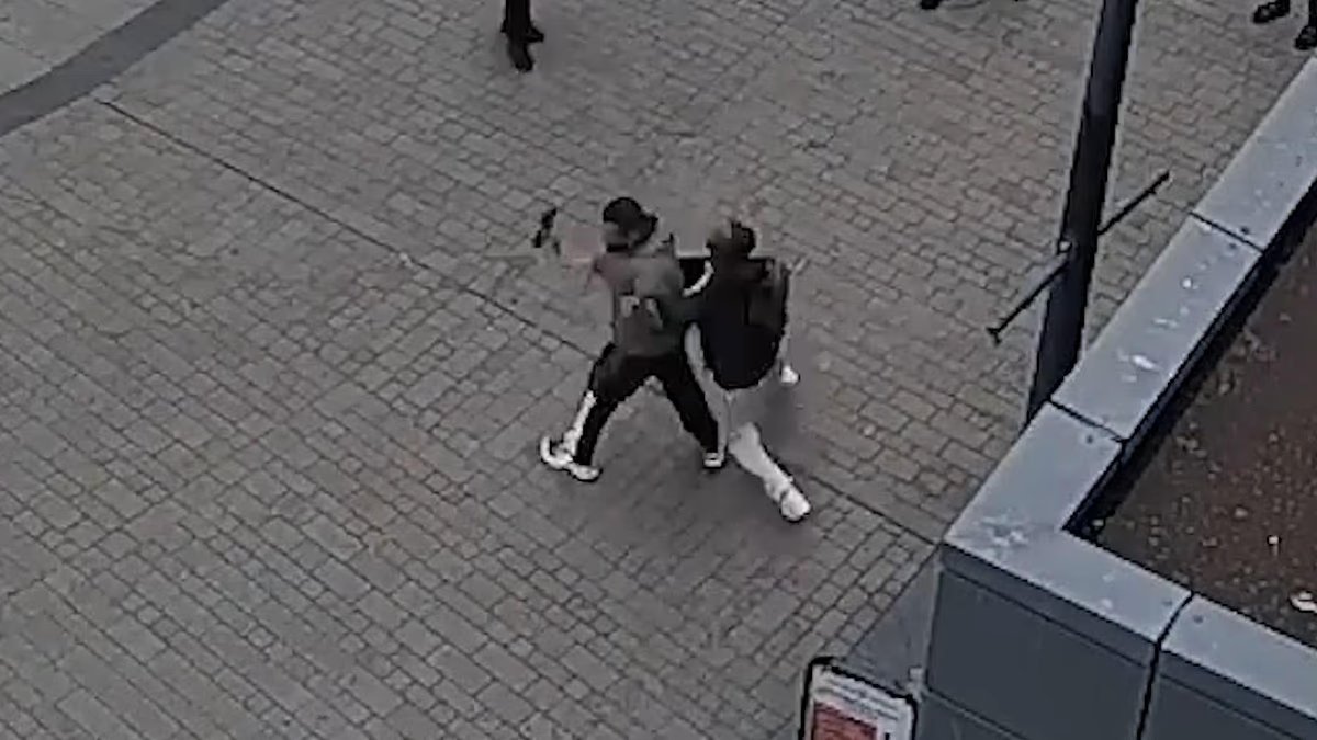 Este es el momento dramático en el que un héroe derriba al suelo a un atacante con una pala, antes de que la policía llegue al lugar y lo arreste.