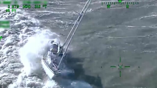 Es un momento dramático que un equipo de rescate de helicóptero costero intentó salvar a un capitán en peligro porque su yate fue arrojado por una fuerte ola.
