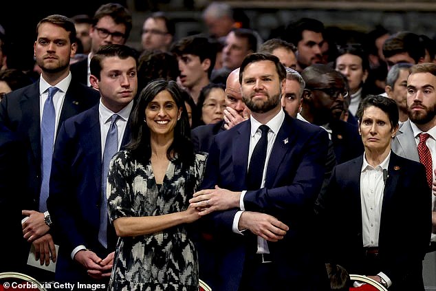 El vicepresidente de EE. UU. JD Vans, su esposa, segunda mujer, las Vans de EE. UU. Y sus hijos participaron en la misa del Viernes Santo en la Basílica de San Pedro el 18 de abril
