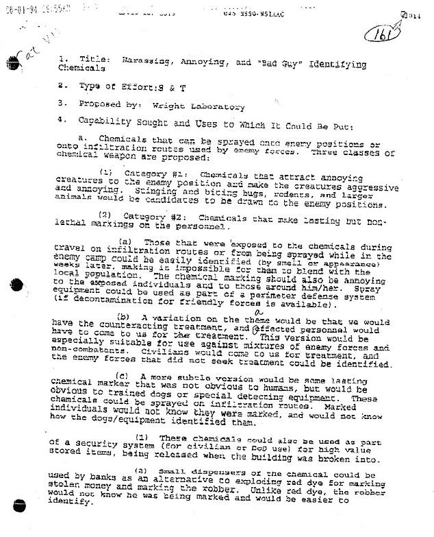 Un documento de tres páginas obtenido por el Proyecto Sunshine, una organización anti -biológica, describe la propuesta de laboratorio para una bomba ‘para que haya un químico que pueda ser homosexual para los soldados enemigos’.