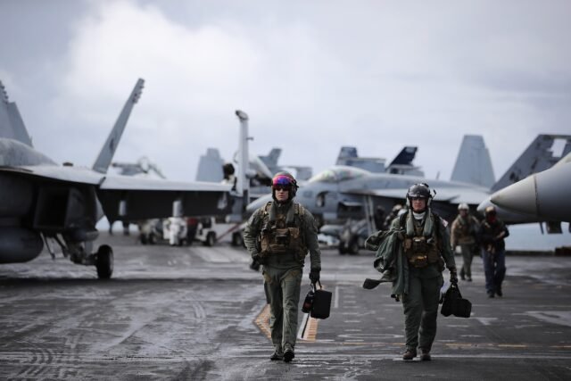 Un tercer portaaviones estadounidense y el buque de guerra que lo protege llegaron a aguas cercanas a Irán el jueves, dijeron funcionarios, ampliando significativamente el poder militar a disposición del presidente Donald Trump cuando acordó lograr que el gobierno de Teherán renunciara a su programa nuclear, reabriera el Estrecho de Ormuz y pusiera fin a una guerra de una semana que ha desestabilizado en gran medida la región.