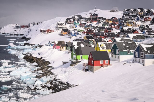 La vivienda Dition Groenlandic fue vista desde el punto de vista de Magazdellen el 27 de marzo de 2021 en Nuuk, Groenlandia. (Leon Neil)