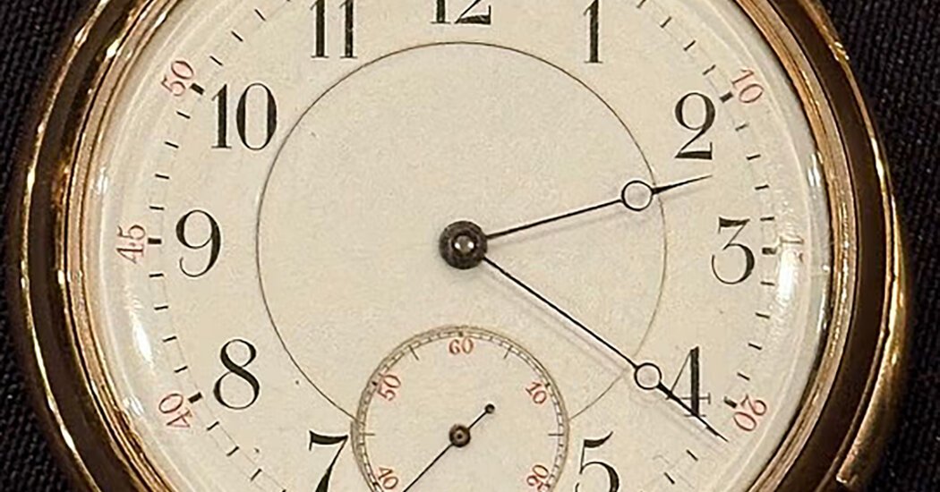 El 15 de abril de 1912, un reloj de bolsillo con adornos de oro dejó de funcionar a las 2:20 a. m., cuando el Titanic se hundió en el Atlántico Norte. Cuando el barco se hundió, se vio a su rico propietario de pie en la cubierta de la mano de su esposa.
