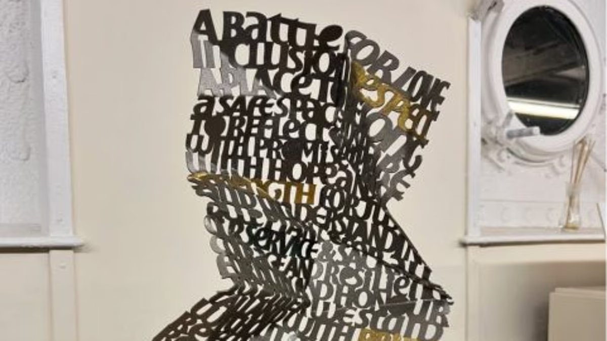 Réplica del nuevo monumento militar LGBT. El homenaje público toma la forma de una carta de bronce arrugada compuesta de palabras extraídas de testimonios de trabajadores afectados por la prohibición.