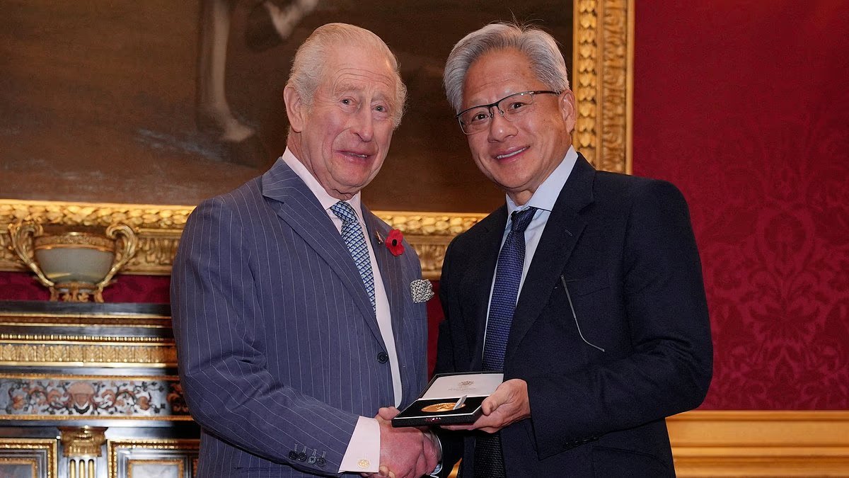 El fundador de Nvidia, Jensen Huang, dijo que King le dio personalmente una copia de un discurso de 2023 que pronunció sobre inteligencia artificial durante una ceremonia de premiación que celebraba a los líderes en el campo. En la imagen: el rey Carlos habla con Jensen Huan durante una recepción en el Palacio de St James en Londres.