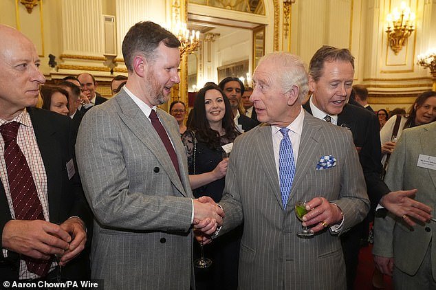 El rey Charles saludó a un invitado durante una recepción en el Palacio de Buckingham, tercer miércoles