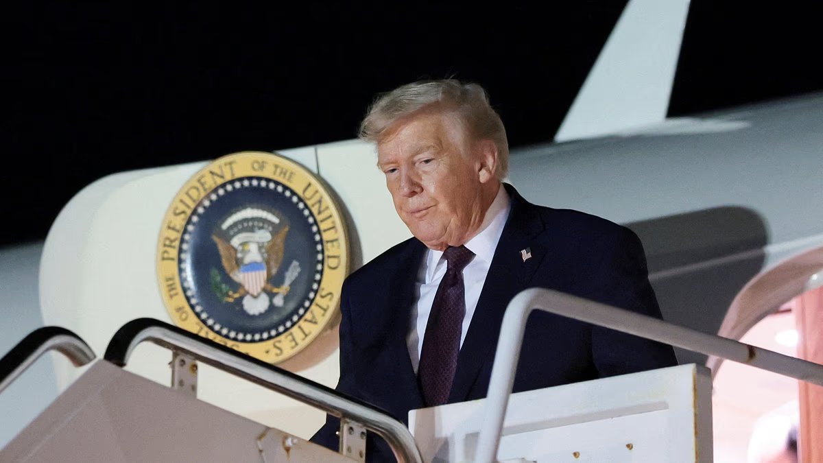 El presidente Donald Trump guardó silencio sobre la publicación de miles de fotografías relacionadas con el pedófilo convicto Jeffrey Epstein mientras hablaba en un mitin el viernes por la noche. Foto: Trump se baja de un avión en el Aeropuerto Internacional de West Palm Beach para dirigirse a su resort Mar-a-Lago