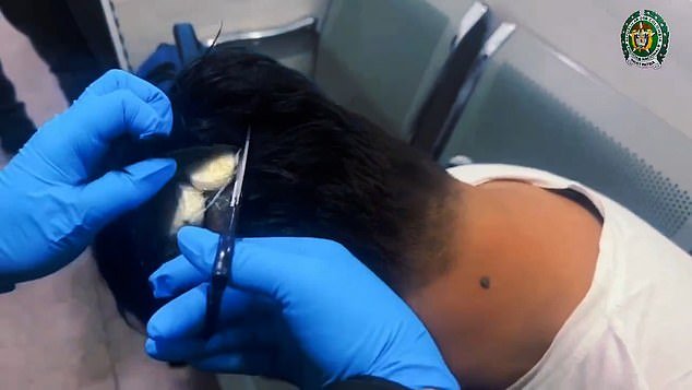 En este punto, la policía cortó la peluca de un hombre con un par de tijeras, para revelar que está escondiendo alrededor de 10,000 cocaína en el fondo