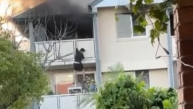Se ha visto a un tipo que escapa de su apartamento en llamas para escapar de un porche, solo unos momentos antes de que su unidad rodee su apartamento en llamas en la Costa de Oro.