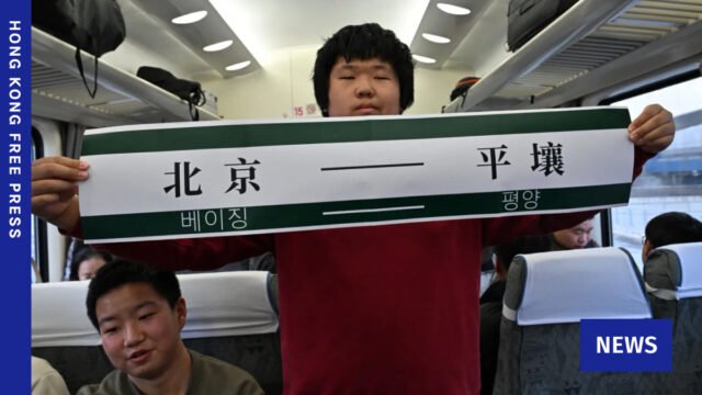 Un hombre sostiene una pancarta que dice “Beijing-Pyongyang” en el tren K27 con destino a Pyongyang en la estación de tren de Beijing el 12 de marzo de 2026. Foto: Adek Berry/AFP.