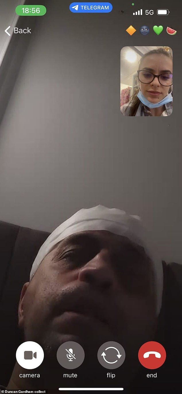Casi al mismo tiempo, tenían una videollamada y él tomó una captura de pantalla que envió a la madre de Desmbazov con un vendaje blanco alrededor de su cabeza.