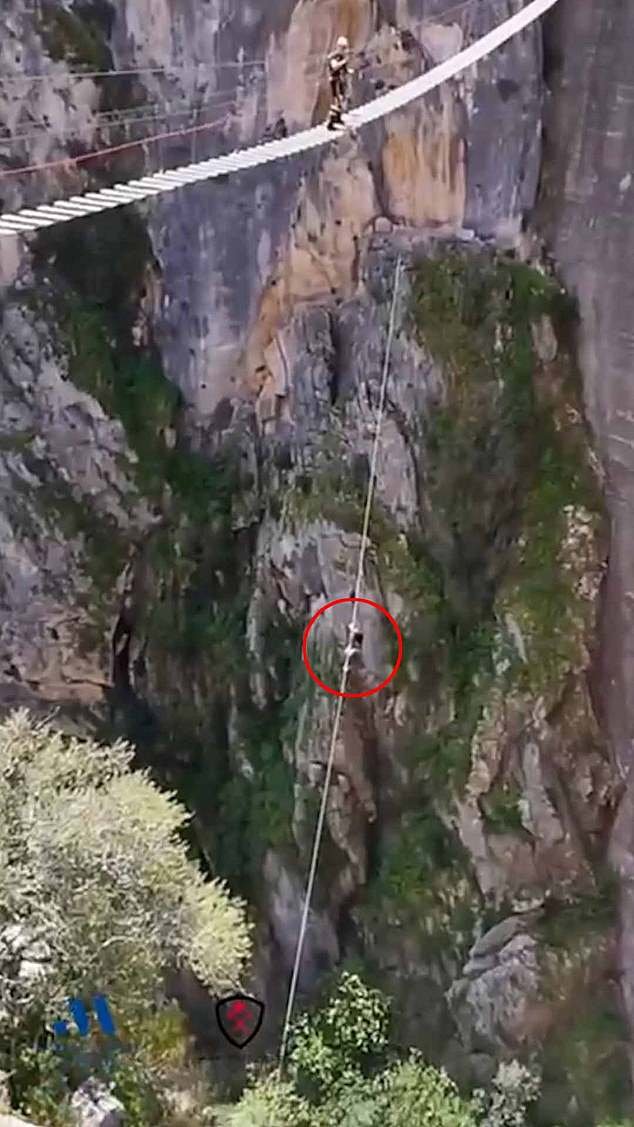 El metraje muestra que el hombre español anónimo colgaba de la cuerda en Rocky Girk, porque los bomberos fueron vistos parados en el puente de la suspensión sobre él cuando estaba listo para rescatarlo.