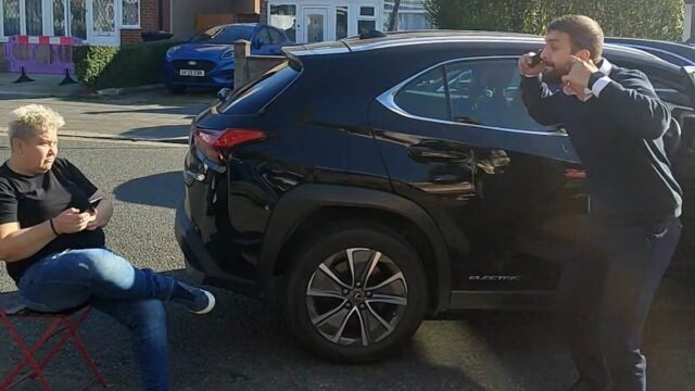 Un hombre que intentó dejar su Lexus negro en la escena salió del auto para hablar con la mujer, que estaba empapado al sol debido a su asiento tranquilo.