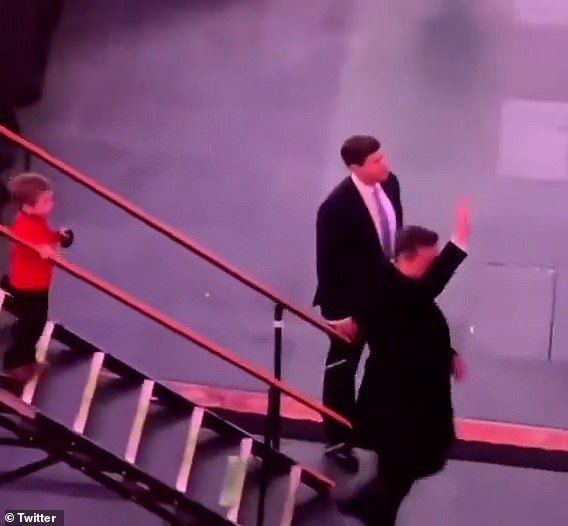 El clip, que se ha vuelto viral desde entonces, muestra a Tesla Bilioneer, quien salió del escenario en el Rally Maga en enero. Fue visto caminando a través de una escalera de metal detrás de su hijo X.
