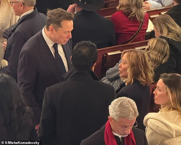 Elon Musk fue visto charlando con la primera ministra italiana, Giorgia Meloni, en la toma de posesión de Donald Trump (en la imagen de arriba), meses después de negar los rumores de una aventura.