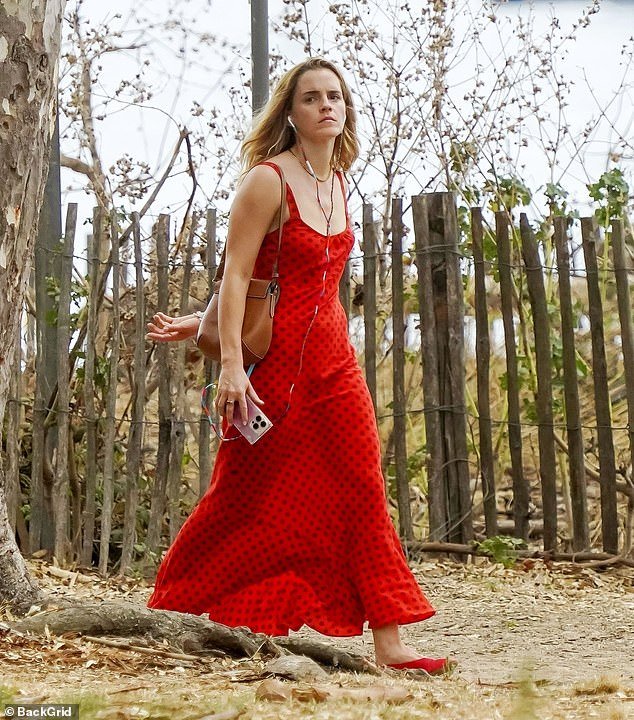 Emma ata el deslumbrante vestido que combinaba con las bombas ataba la pareja y su aparición de verano terminó llevando sus pertenencias a una mini bolso de cuero marrón elegante