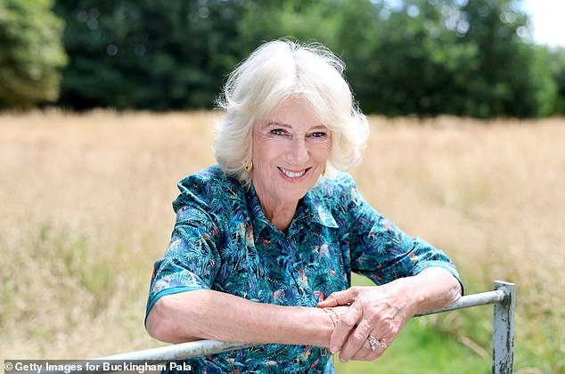 Camilla es retratada con una gran sonrisa en su rostro porque está arriesgando la cerca frente a la cerca mientras disfrutaba del cálido día de verano en su casa.