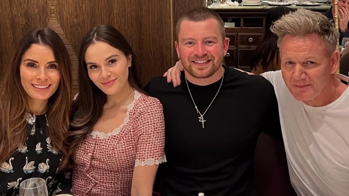 Holly Ramsey (en la foto, segunda a la izquierda) disfrutando de una comida con su prometido Adam Peaty (en la foto, segunda a la derecha) y sus padres Tana (extremo izquierdo) y Gordon (extremo derecho)
