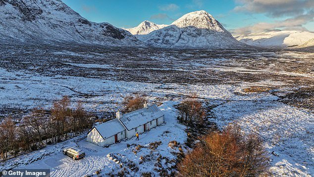 La nieve cae hoy alrededor de Black Rock Cottage frente a Buachile Etive Moor en Glencoe, Escocia.