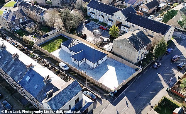 Una escena gaseosa de la casa que ha sido desgarrada en su jardín y reemplazada por losas de concreto