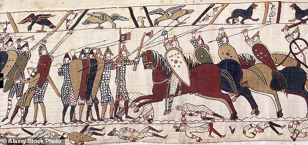 Tapstri representa la Guerra de Hastings y detallada, para describir las imágenes originales con King Harold con la etiqueta latina que fue asesinada en mi mito con una flecha en los ojos (ilustrado)