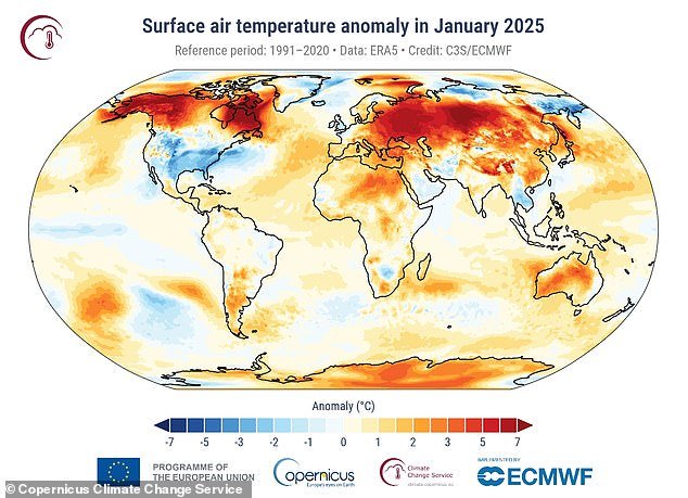 Según CS3, ubicado en el hueso de Alemania, el último mes fue de 3.15 grados Fahrenheit (1.75 grados centígrados) por encima del promedio de enero para 1850-1900.