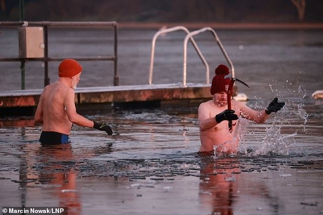 Gran Bretaña sufrió su noche de enero más fría en 15 años, cuando las temperaturas cayeron a -19°C y el clima era tan frío que los nadadores tuvieron que romper el hielo para bucear.