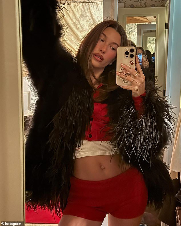 Hailey estaba de pie de lado un par de pantalones cortos rojos animados, así como un suéter rojo recortado y su tono medio tonificado en la parte superior del tanque blanco, después de dar la bienvenida a su hijo Jack Jack en agosto.