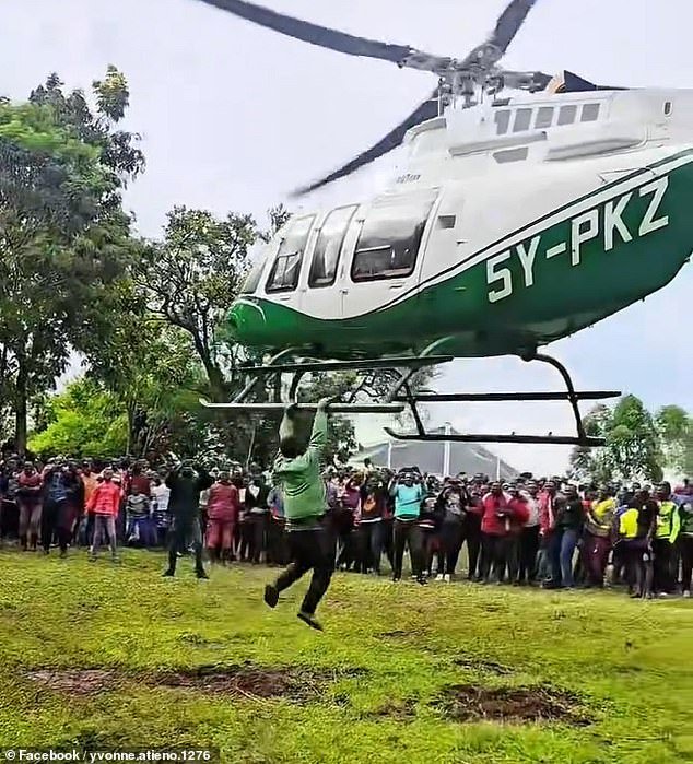 Las imágenes que detienen el corazón se muestran a Stephen Odymbo Oma cuelga unos cientos de pies en el aire y atascado para una vida favorita que está subiendo por el cielo