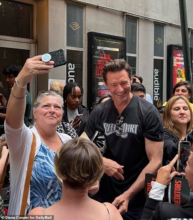 En las fotos recibidas por DailyMail.com, el actor de Walverine fue visto riéndose fuera del Teatro Minetta Lane el viernes cuando tomó fotos con los fanáticos