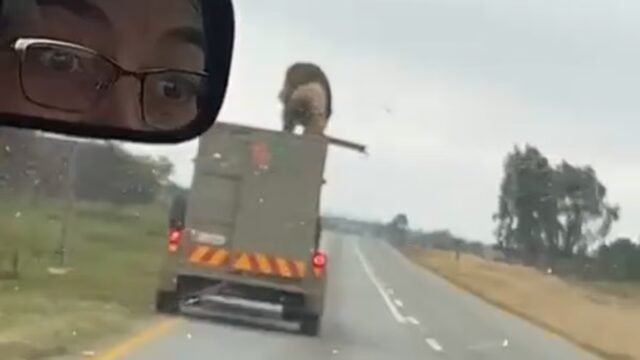 Un pasajero que circulaba por la carretera R49 entre Bakerville y Lichtenberg logró escapar del león macho a través de la trampilla del techo del camión.