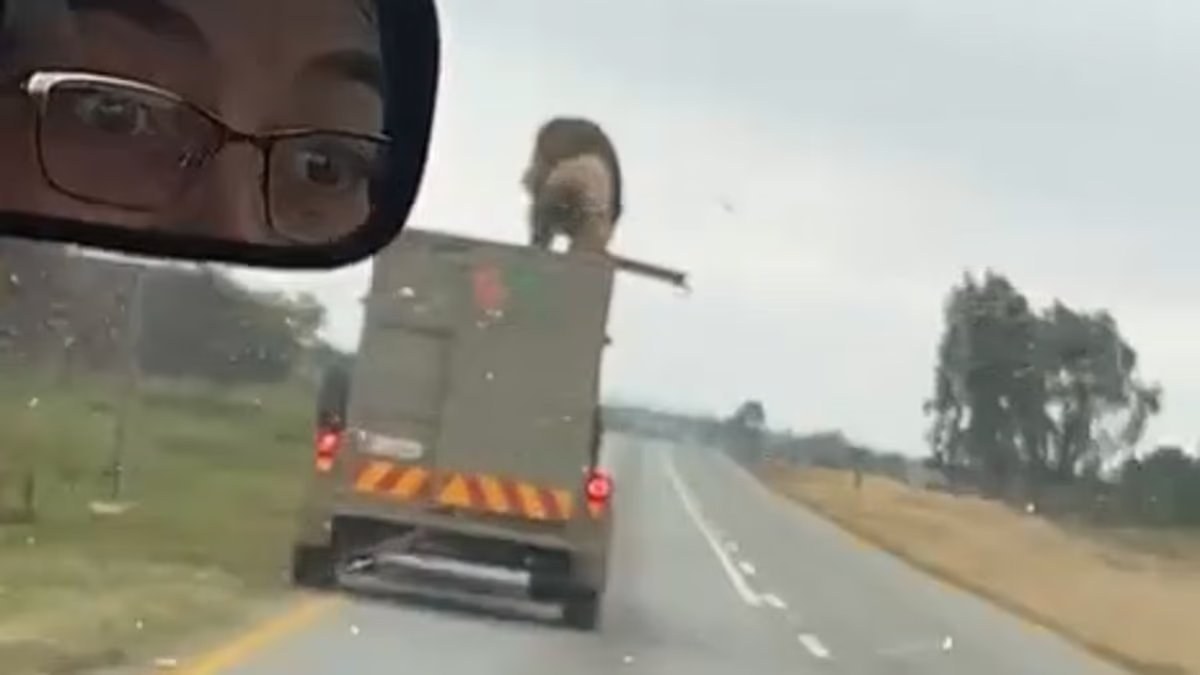 Este es el momento extraordinario en el que un león gigante saltó desde lo alto de un remolque antes de trotar por una carretera sudafricana y estrellarse contra el suelo.
