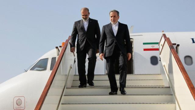 El ministro de Relaciones Exteriores iraní, Abbas Araghchi, habla con funcionarios omaníes
