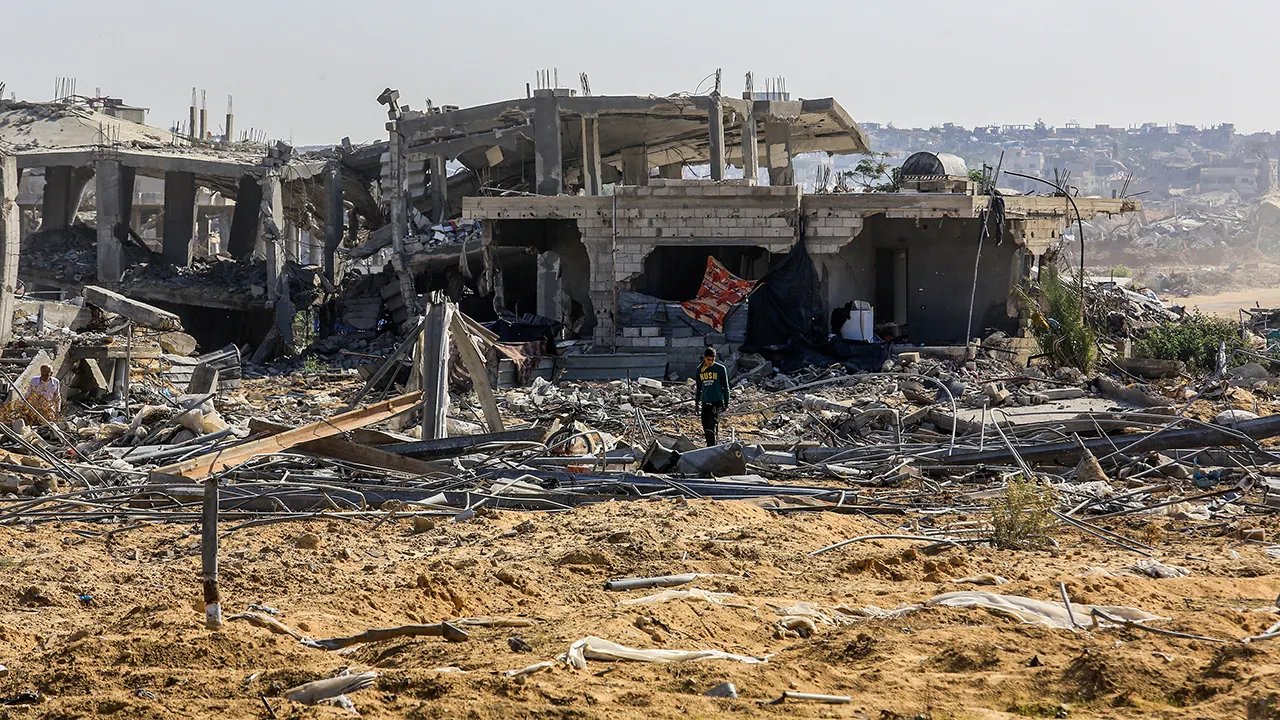 Un hombre camina entre daños y escombros en Khan Younis, Franja de Gaza