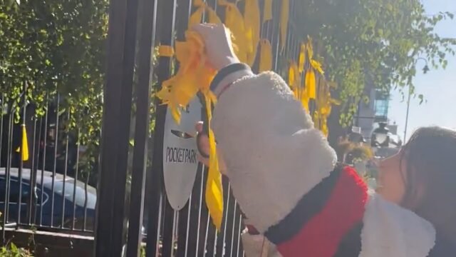 Esta semana sólo hay que estar atento a las actividades de la arrogante joven Nadia Dina Yahlom, que utiliza tijeras para recordar a los rehenes israelíes de un monumento en el norte de Londres esta semana. Les dice que han justificado sus actividades maliciosas: ¿quién o qué? ¿Cintas, judíos, rejas? – Se lo merece porque lo llaman ‘genocidio’.