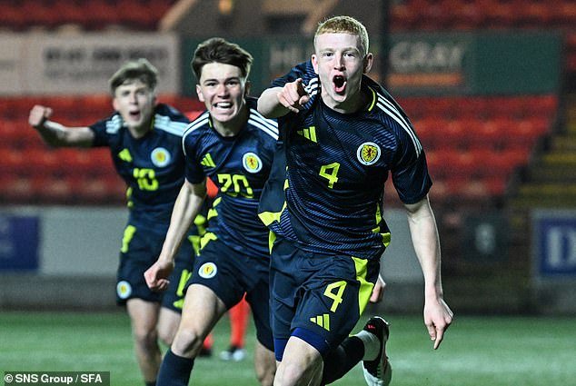 Hayden Bourland se mudó en celebración después de anotar el Scoland U17 contra Rumania
