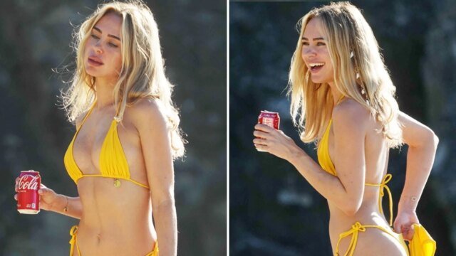 Kimberly Garner se desnuda en un diminuto traje de baño en una playa caribeña