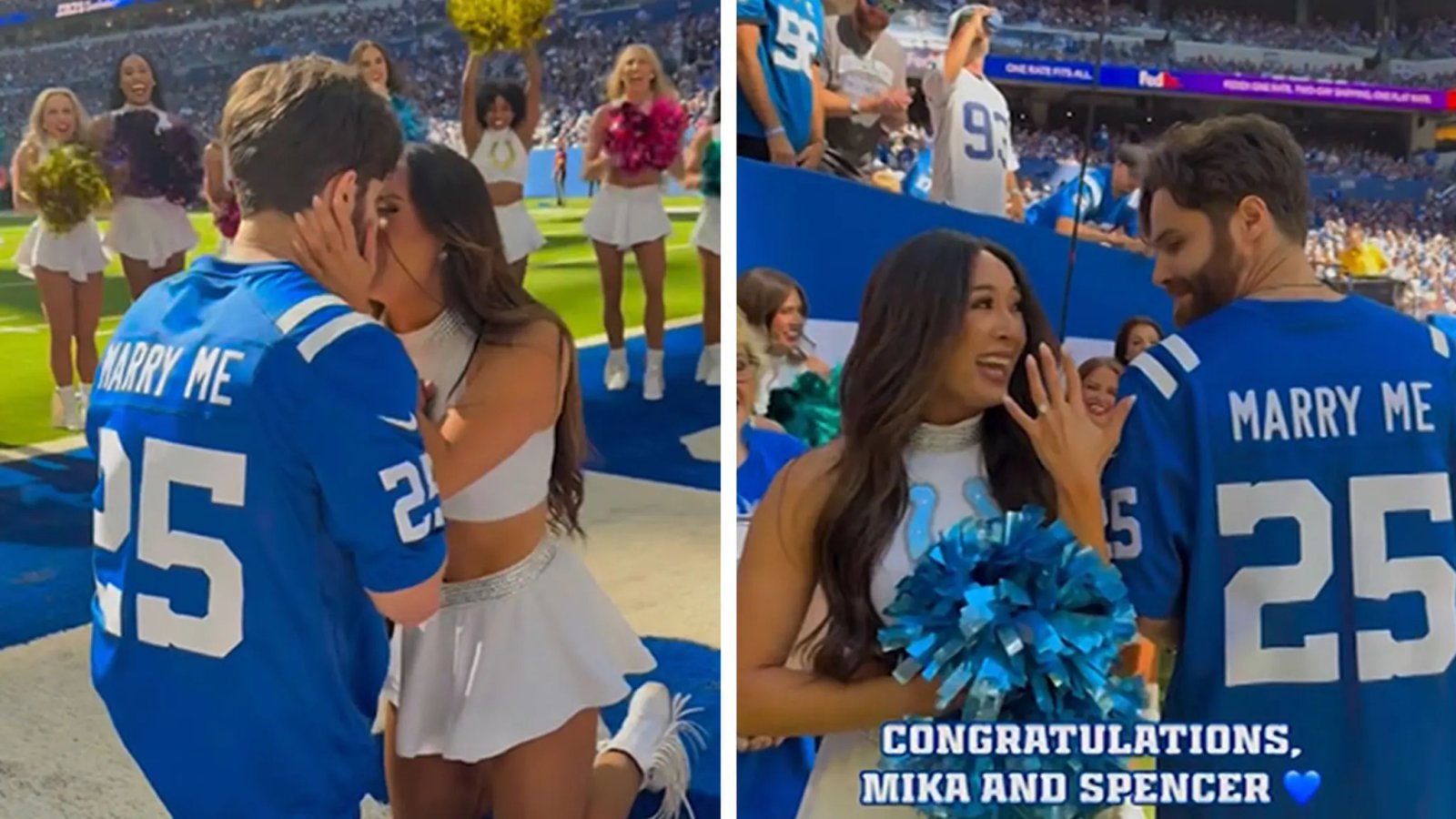 El equipo de porristas de los Colts estaba a mitad de su rutina, actuando hasta la zona de anotación en la segunda mitad, una persona que llevaba “Cásate conmigo” estaba esparcida detrás de la camiseta personalizada de los Colts. mika