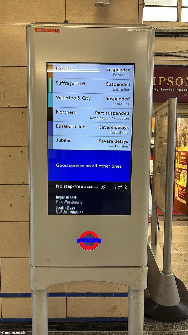 Woolwich, Whitcaple, Waterloo, Swiss Cottage, South Kensington, Putney Bridge, Abbey Wood, Canary Warf y Custom House también se cerraron o se cerraron parcialmente.